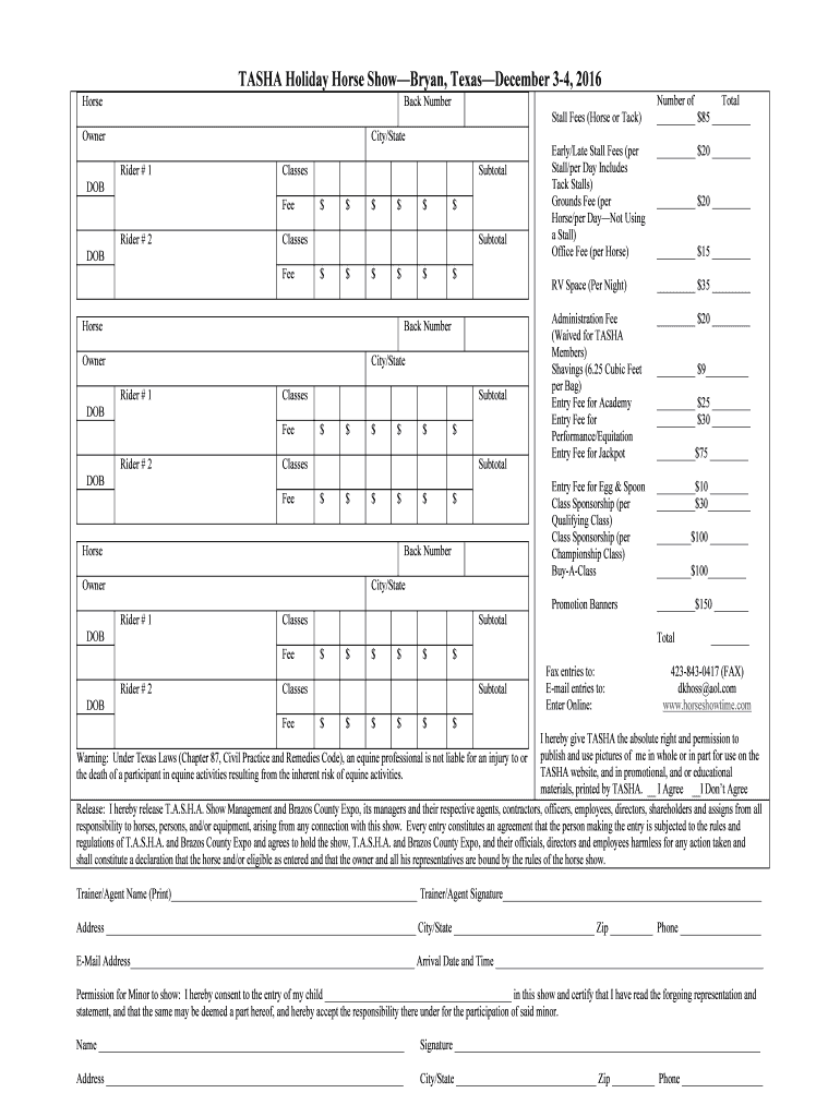 TASHA Holiday Horse Show Bryan, Texas December 34, 2016, Horse Back Number Owner Stall Fees (Horse or Tack) City/State Rider # 1 Classes Rider # $$$$$2 Classes Subtotal DOB Fee $ $ $ $ Horse $ $ Back