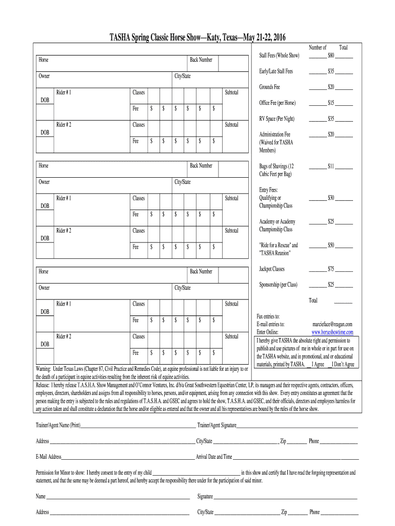 TASHA Spring Classic Horse Show Katy, Texas May 2122, 2016 Horse Stall Fees (Whole Show) Owner Rider # 1 DOB Fee Rider # $$$$$$2 Classes Subtotal DOB Fee $ $ $ $ Horse $ $ Back Number Owner $20 ×15