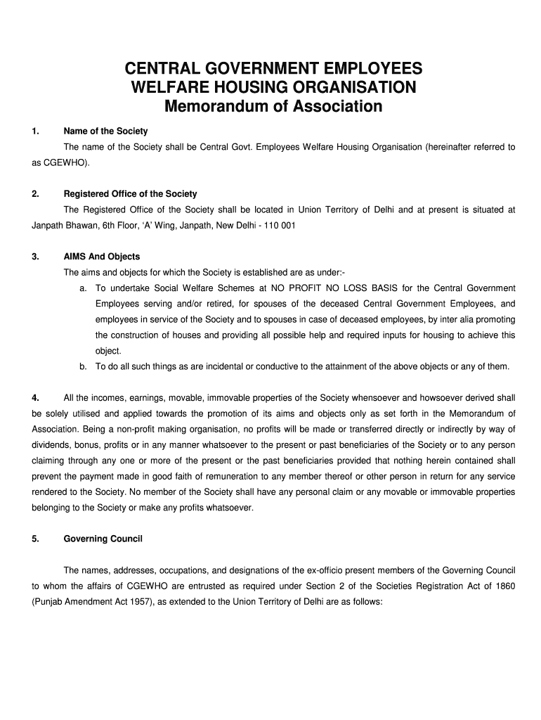 CENTRAL GOVERNMENT EMPLOYEES WELFARE HOUSING Organization Memorandum of Association 1. Name of the Society The name of the Society shall be Central Govt. Employees Welfare Housing Organization (hereinafter