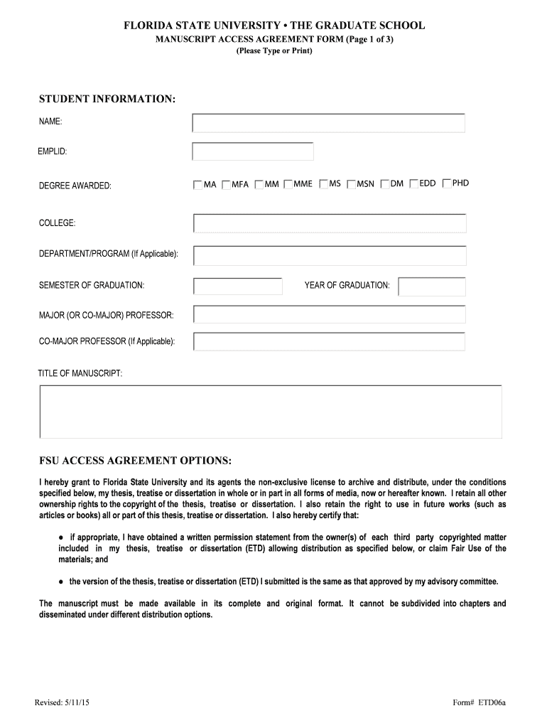 Get the free Florida State University Manuscript Access Agreement Form