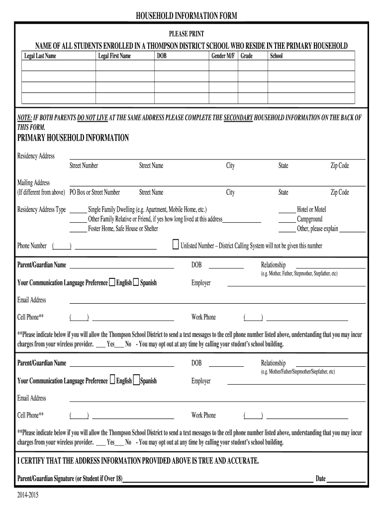 This form. Primary household information residency address ... 2014-2015 secondary household information if both parents do not live at the primary address, ...