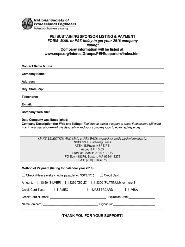 Get the free PEI SUSTAINING SPONSOR LISTING & PAYMENT - nspe