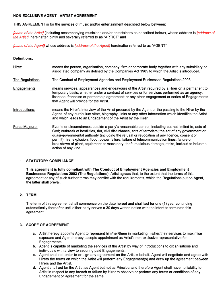 Get the free NON-EXCLUSIVE AGENT - ARTIST AGREEMENT
