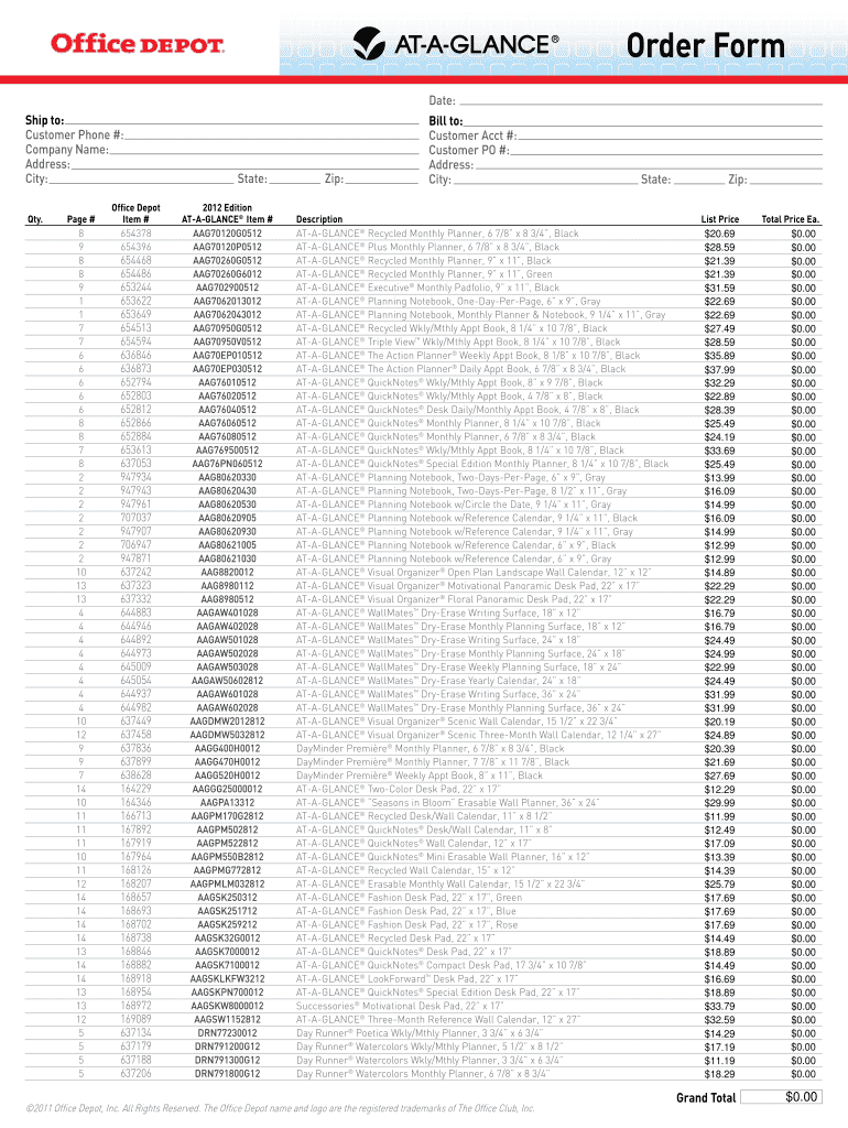 The Office Depot Order Form is a business document used by companies to place orders for AT-A-GLANCE® and Day Runner® products.