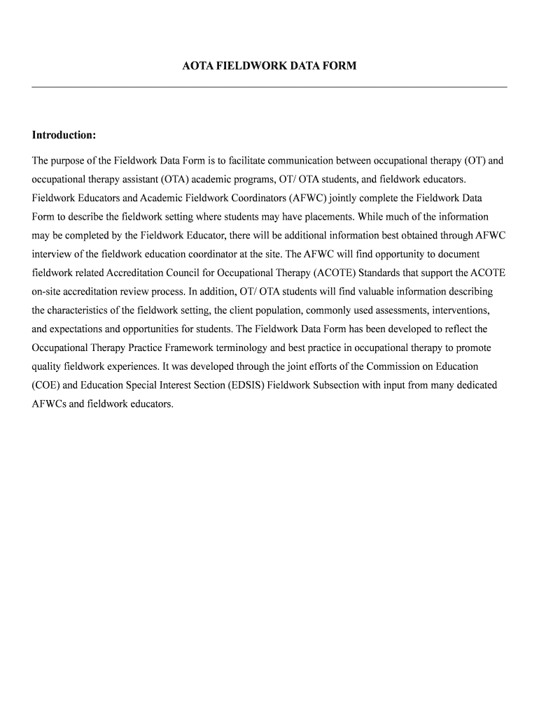 ALTA FIELDWORK DATA FORM. Introduction ... Form to describe the fieldwork setting where students may have placements. While much ..... Revised 5/23/2013 ...