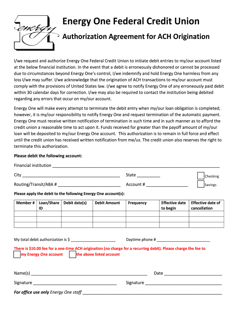 Authorization Agreement for ACH Origination I/we request and authorize Energy One Federal Credit Union to initiate debit entries to my/our account listed