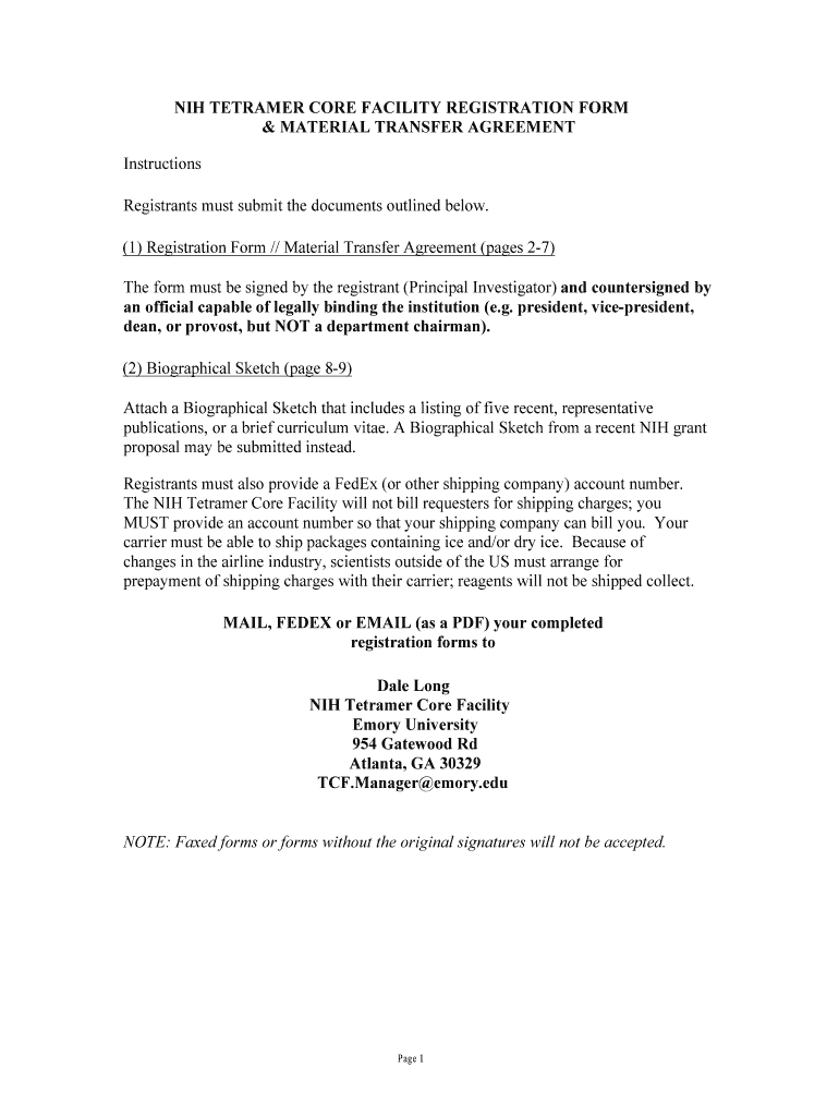 NIH TETRA MER CORE FACILITY REGISTRATION FORM & MATERIAL TRANSFER AGREEMENT Instructions Registrants must submit the documents outlined below. (1) Registration Form ...