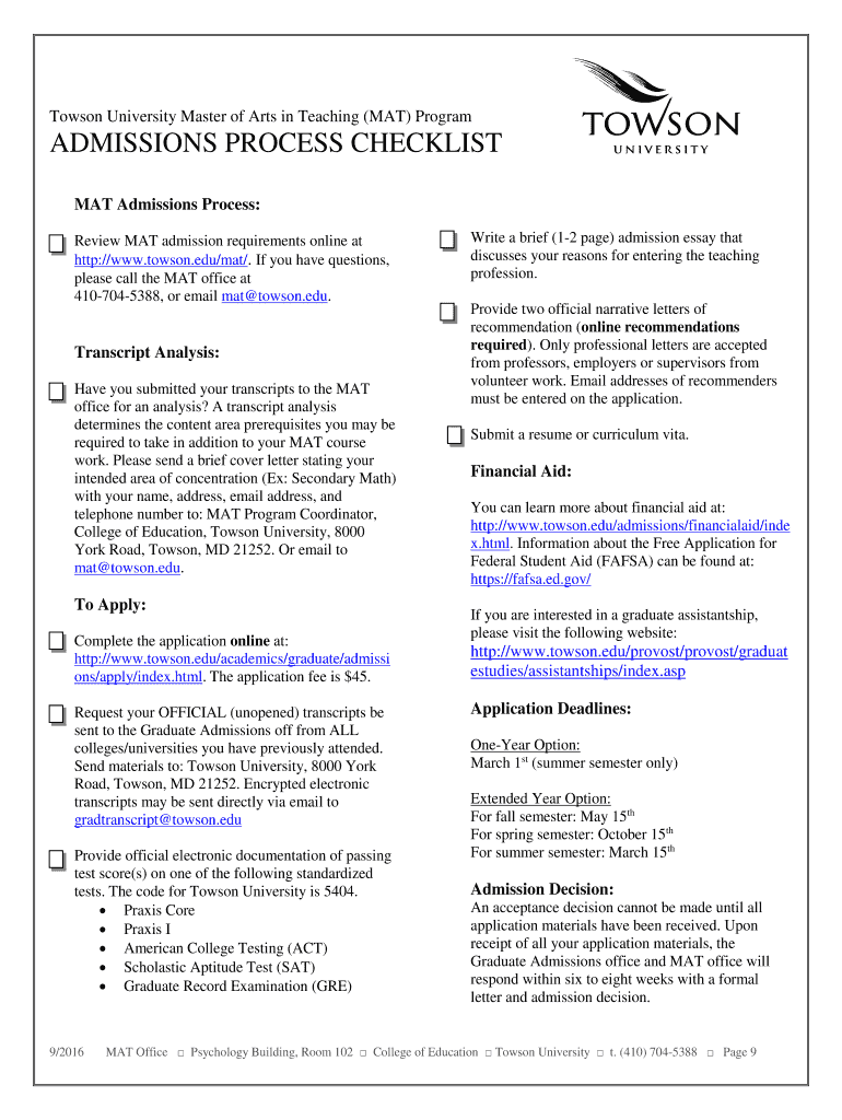 Towson University Master of Arts in Teaching (MAT) ProgramADMISSIONS PROCESS CHECKLIST