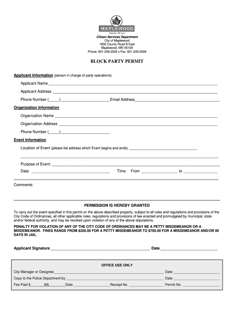 BLOCK PARTY GUIDELINES. 1. City permit must be obtained from City Clerk; ... BLOCK PARTY PERMIT. Applicant Information (person in charge of party operations)