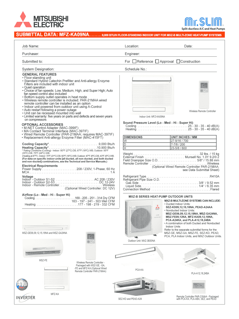 Submittal data mfz-ka09na must include detailed information about the product or equipment such as specifications, performance data, certifications, and testing results.