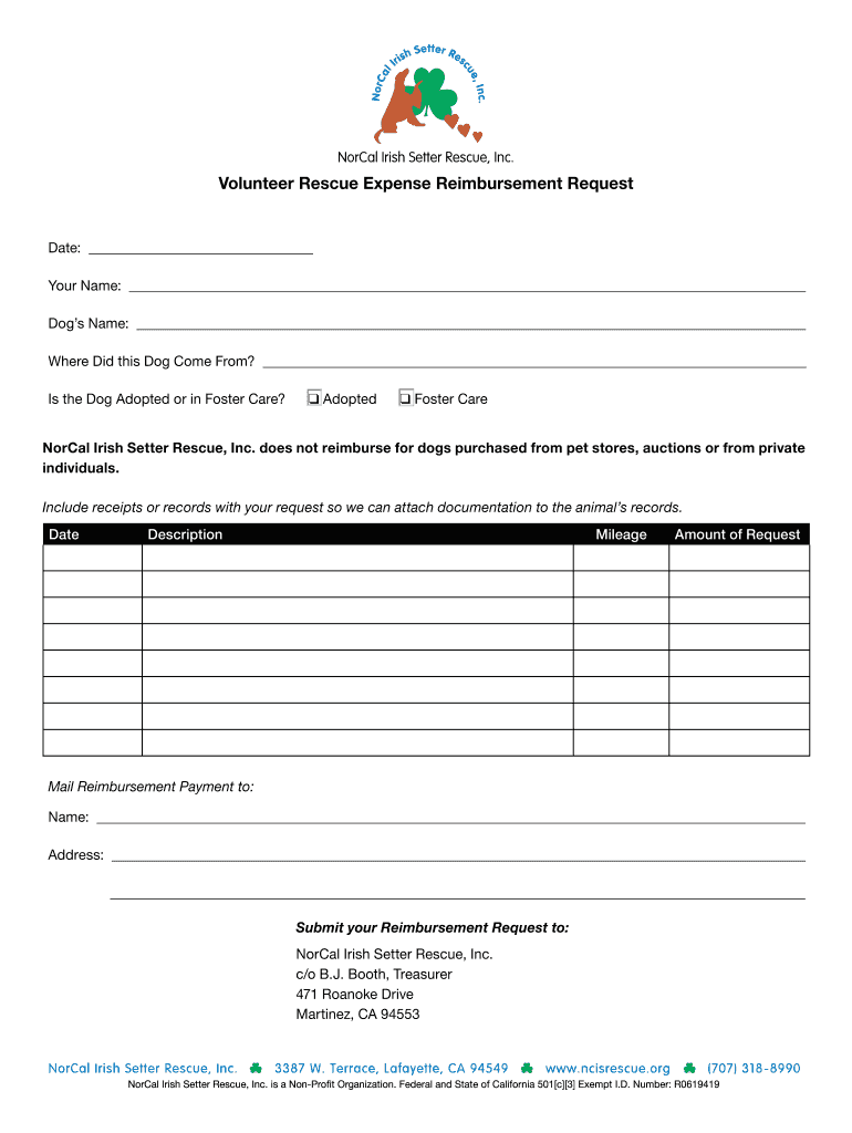 Get the free NCISR Expense Reimbursement Form - NorCal Irish Setter Rescue ... - ncisrescue