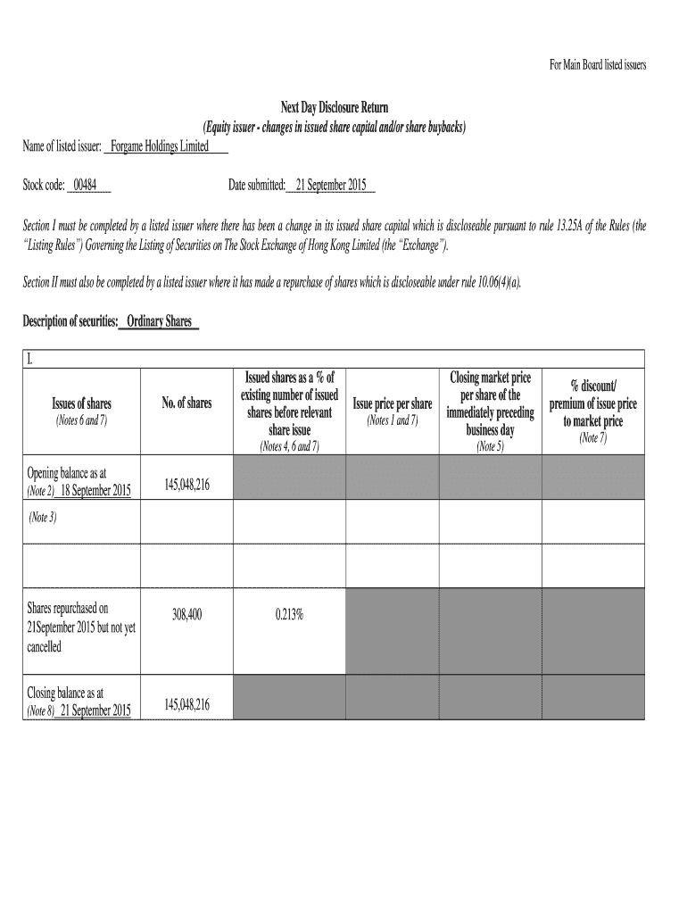 For Main Board listed issuers Name of listed issuer: Next Day Disclosure Return (Equity issuer changes in issued share capital and/or share buybacks) Forgave Holdings Limited Stock code: 00484 Date