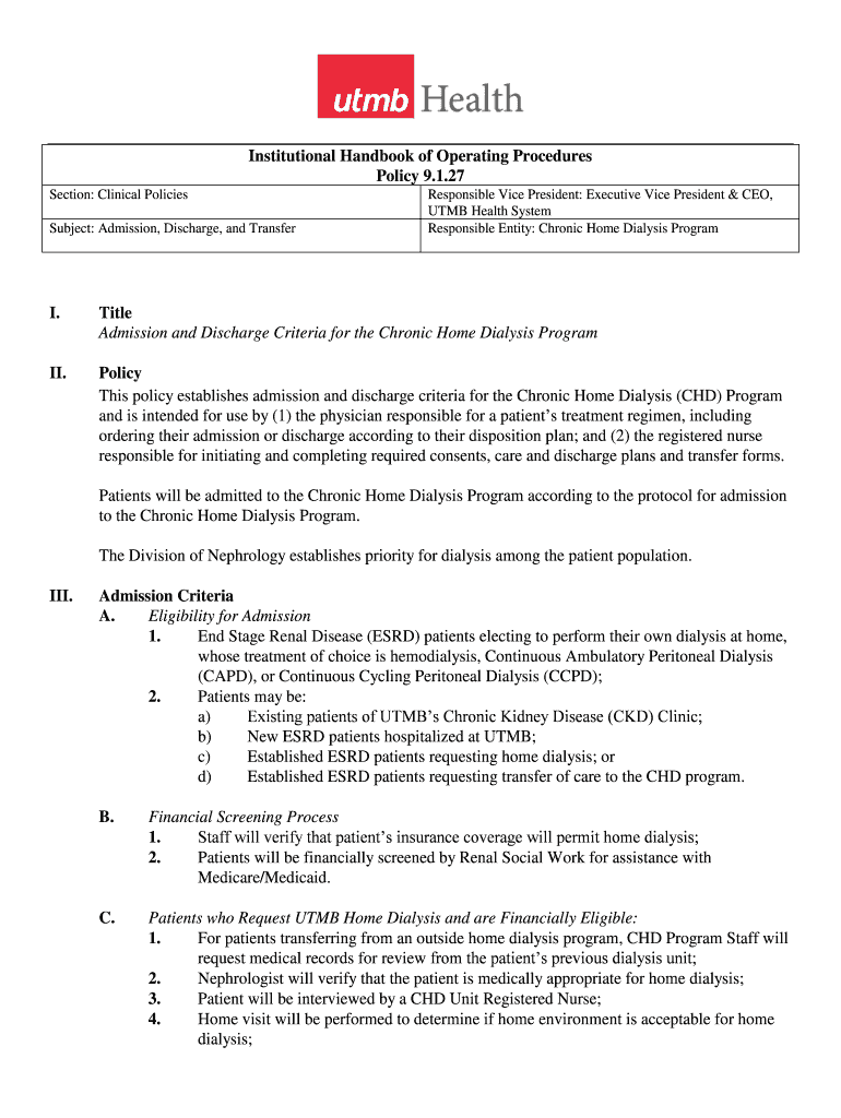 Institutional Handbook of Operating Procedures Policy 9.1.27 Section: Clinical Policies Subject: Admission, Discharge, and TransferResponsible Vice President: Executive Vice President & CEO, TMB Health