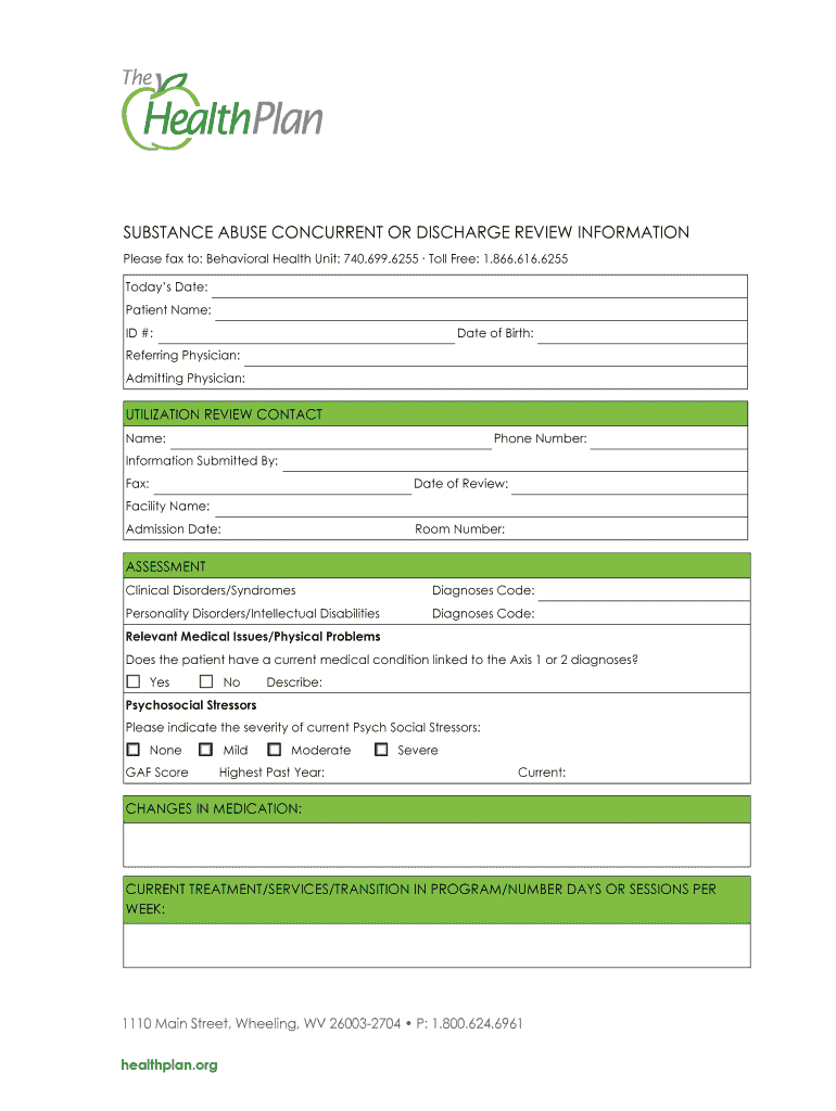 SUBSTANCE ABUSE CONCURRENT OR DISCHARGE REVIEW INFORMATION Please fax to: Behavioral Health Unit: 740.699.6255 Toll Free: 1.866.616.6255 Today s Date: