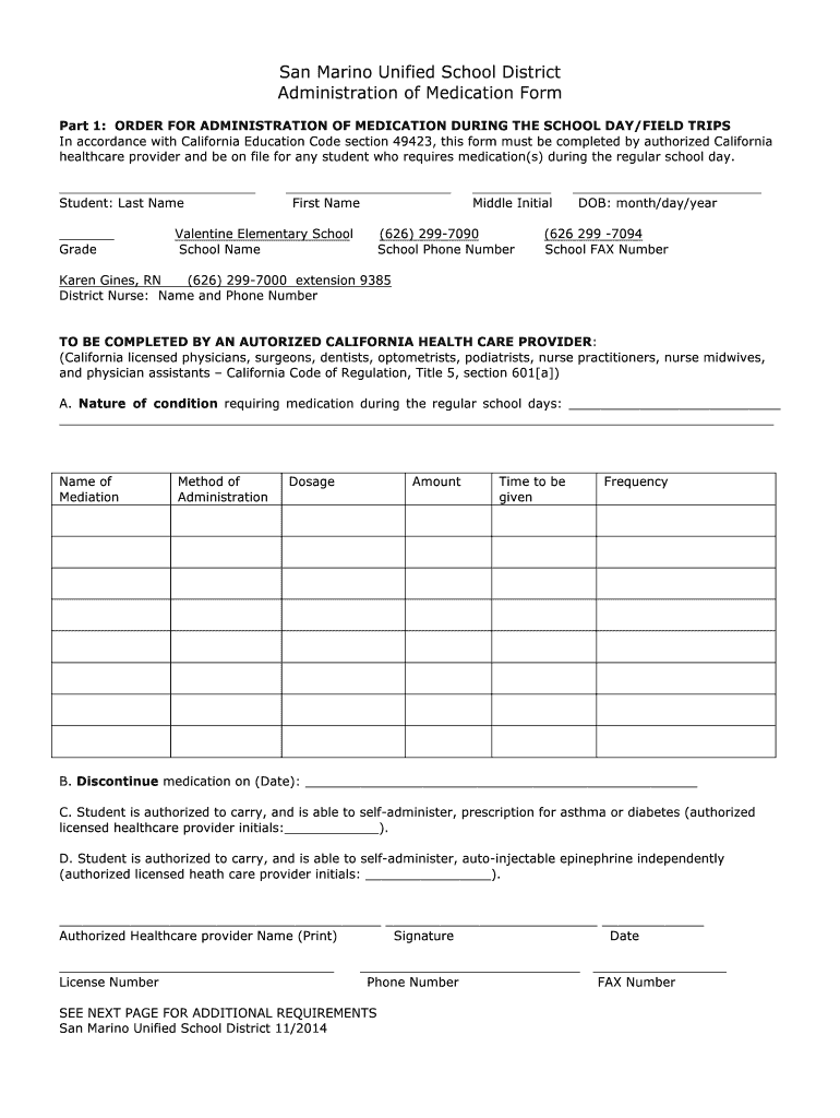 San Marino Unified School District Administration of Medication Form Part 1: ORDER FOR ADMINISTRATION OF MEDICATION DURING THE SCHOOL DAY/FIELD TRIPS In accordance with California Education Code section