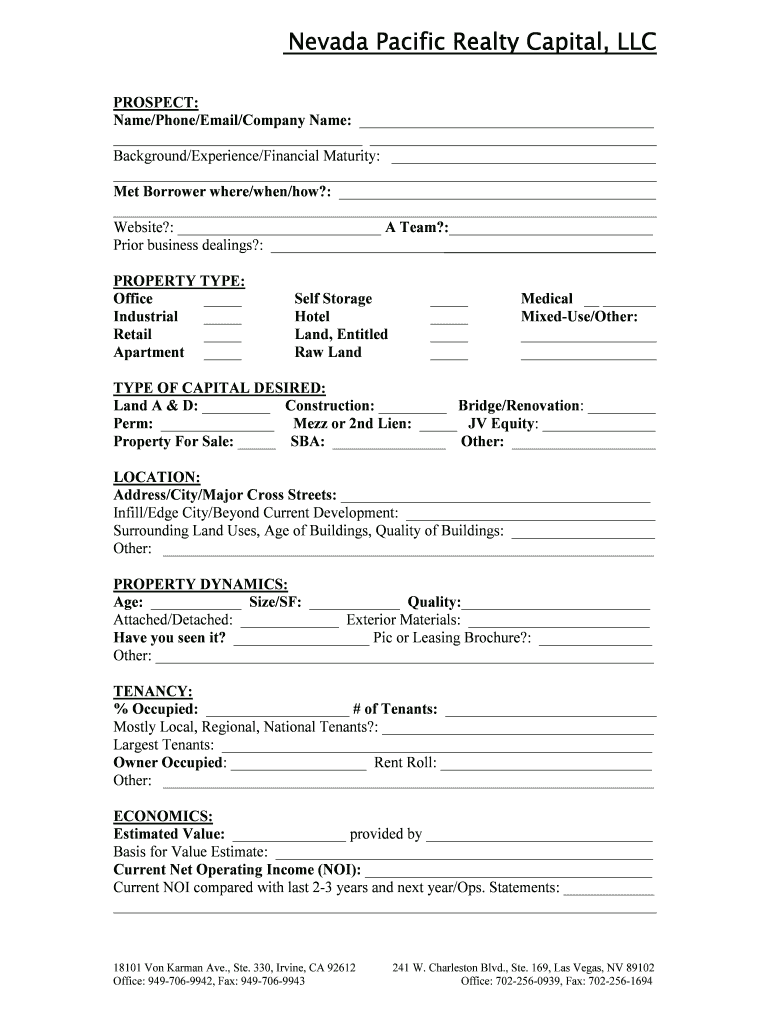 Nevada Pacific Realty Capital, LLC PROSPECT: Name/Phone/Email/Company Name: Background/Experience/Financial Maturity: Met Borrower where/when/how?: Website?: A-Team?: Prior business dealings?: PROPERTY