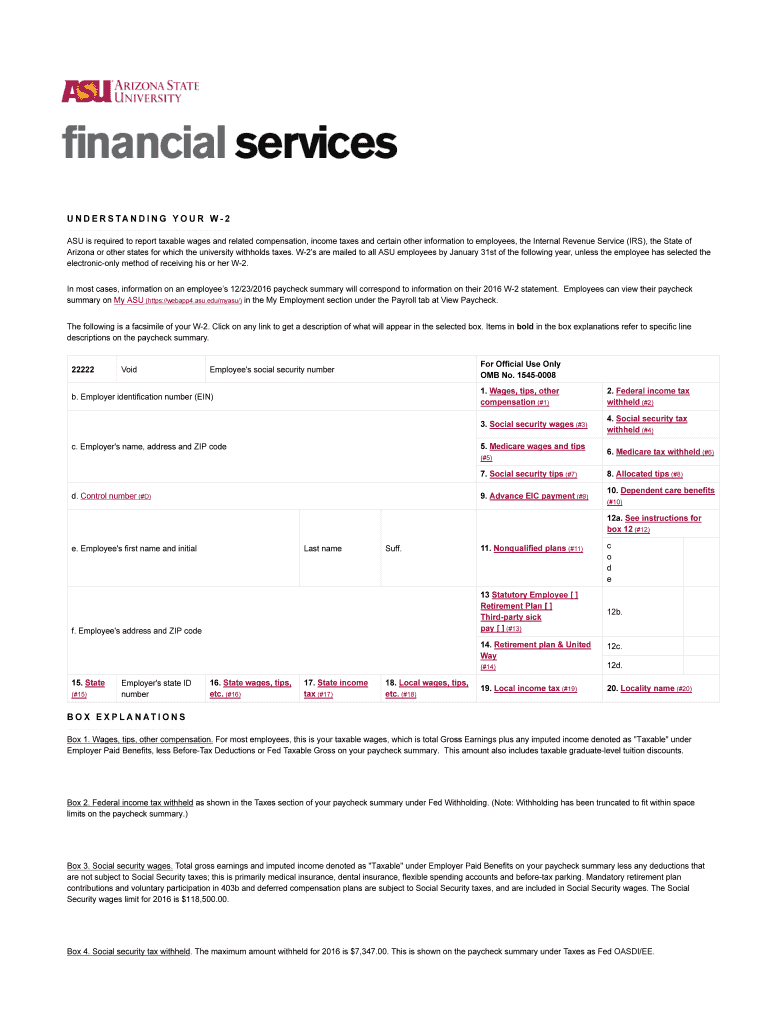 U N D E R S TA N D I N G Y O U R W 2 ASU is required to report taxable wages and related compensation, income taxes and certain other information to employees, the Internal Revenue Service (IRS),
