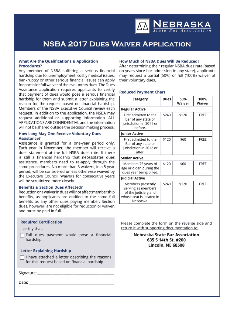 The NSBA dues waiver application can be filled out online or by requesting a paper form from the NSBA. It requires information about the applicant's financial situation and reason for requesting the waiver.