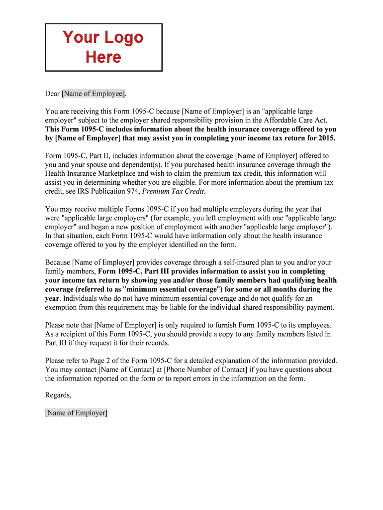 Dear Name of Employee, You are receiving this Form 1095C because Name of Employer is an “applicable large employer subject to the employer shared responsibility provision in the Affordable Care