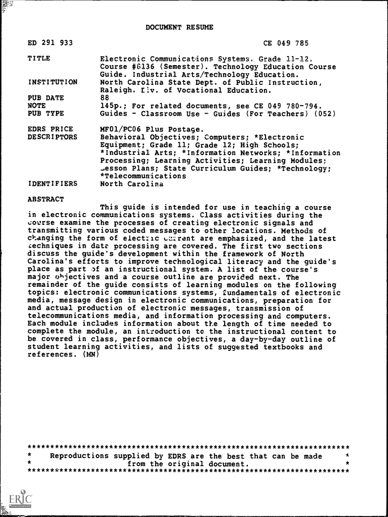 DOCUMENT RESUME ED 291 933 TITLE INSTITUTION PUB DATE NOTE PUB TYPE CE 049 785 Electronic Communications Systems. Grade 1112. Course 10136 (Semester). Technology Education Course Guide. Industrial
