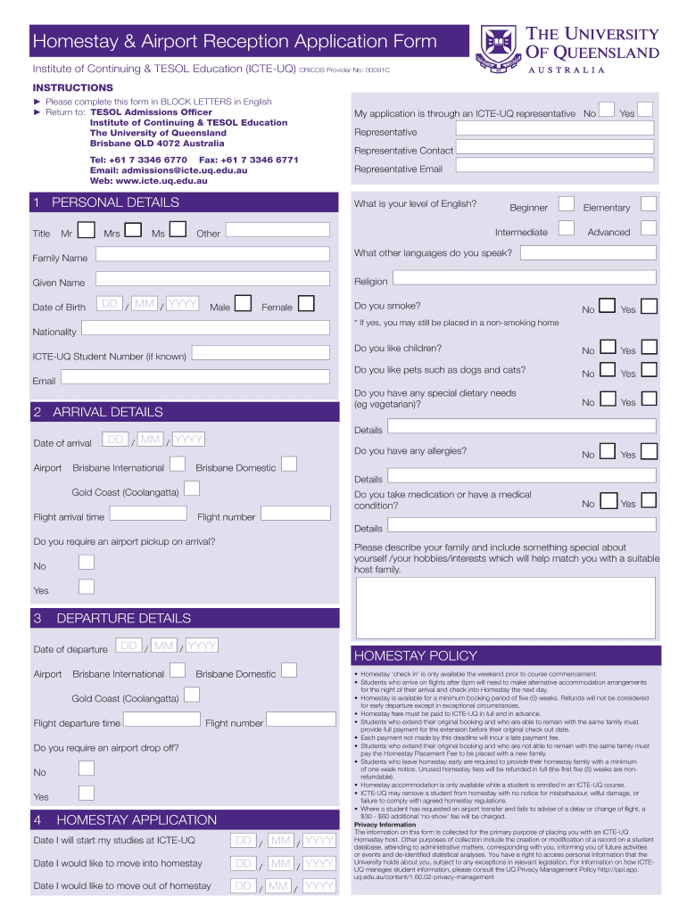 Homestay & Airport Reception Application Form: Institute of Continuing & TESOL Education ... Homestay check in is only available the weekend prior to course ...