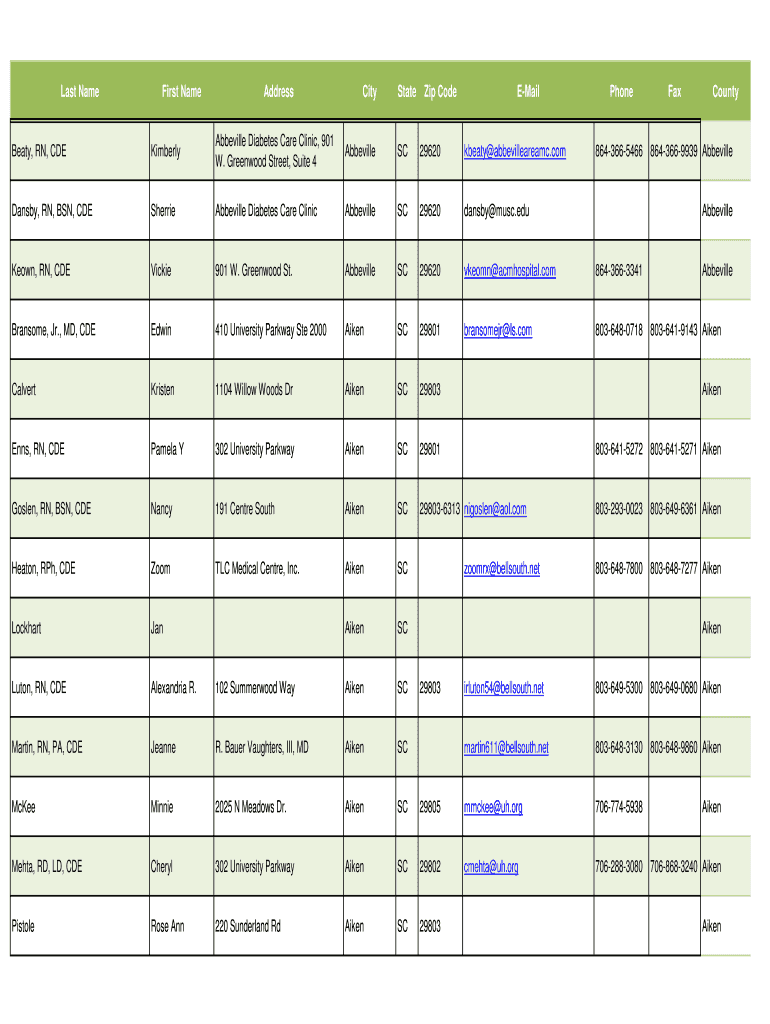 Last Name First Name Address City State Zip Code Email Phone Fax County Beat, RN, CDE Kimberly Asheville Diabetes Care Clinic, 901 W. Greenwood Street, Suite 4 Asheville SC 29620 beat abbevilleareamc.com