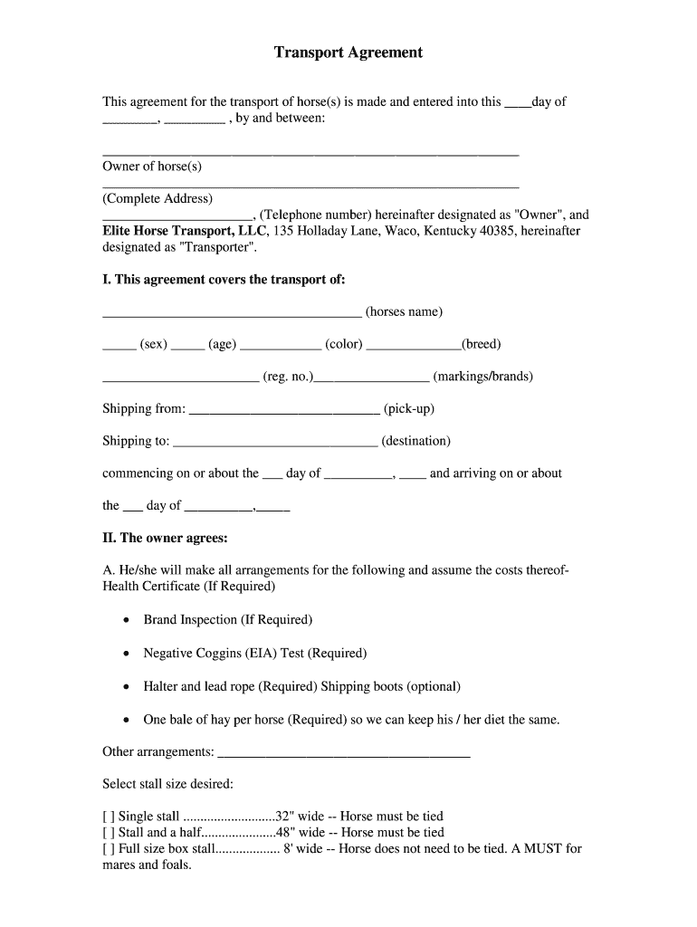 Transport Agreement This agreement for the transport of horse(s) is made and entered into this day of, by and between: Owner of horse(s) (Complete Address), (Telephone number) hereinafter designated