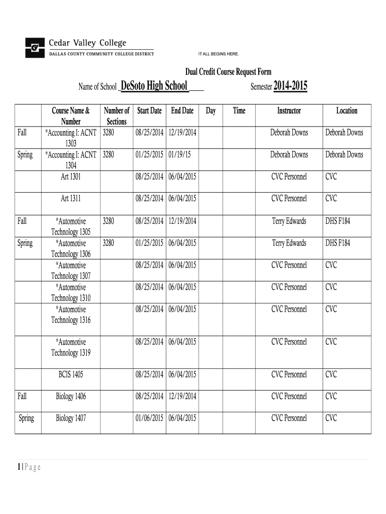 Dual Credit Course Request form/b. 1 Page. Name of School DeSoto High BR School. Semester 2014b2015/b.