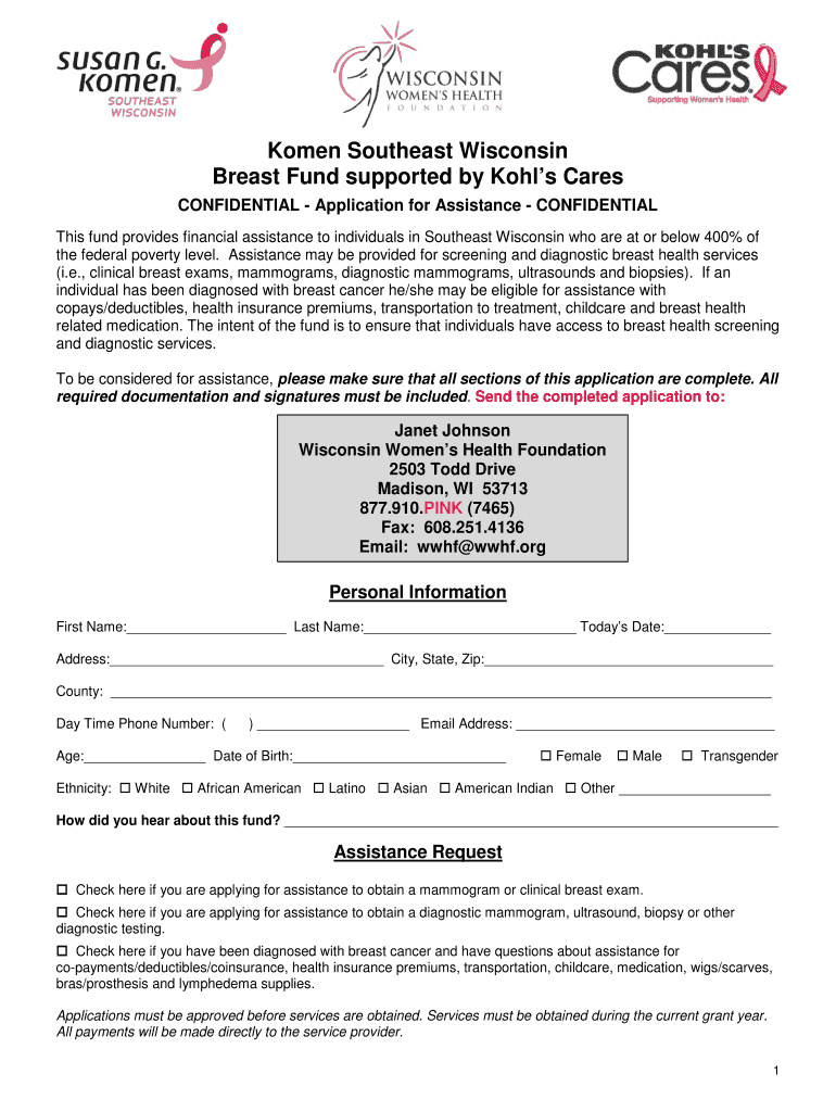Women Southeast Wisconsin Breast Fund supported by Kohl's Cares CONFIDENTIAL Application for Assistance CONFIDENTIAL This fund provides financial assistance to individuals in Southeast Wisconsin who