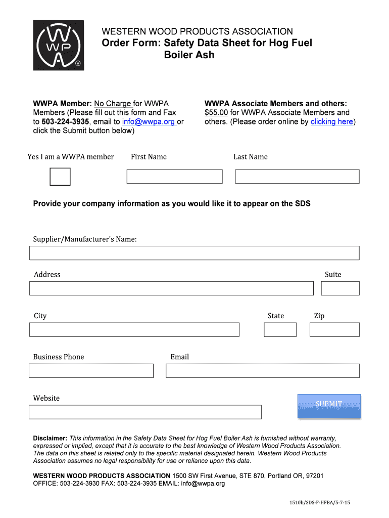 WESTERN WOOD PRODUCTS ASSOCIATION Order Form: Safety Data Sheet for Hog Fuel Boiler Ash WPA Member: No Charge for WPA Members (Please fill out this form and Fax