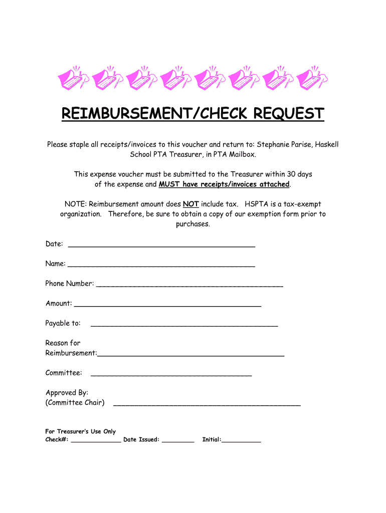 REIMBURSEMENT/CHECK REQUEST. Please staple all receipts/invoices to this voucher and return to: Stephanie Paris, Haskell School PTA Treasurer, in PTA Mailbox.