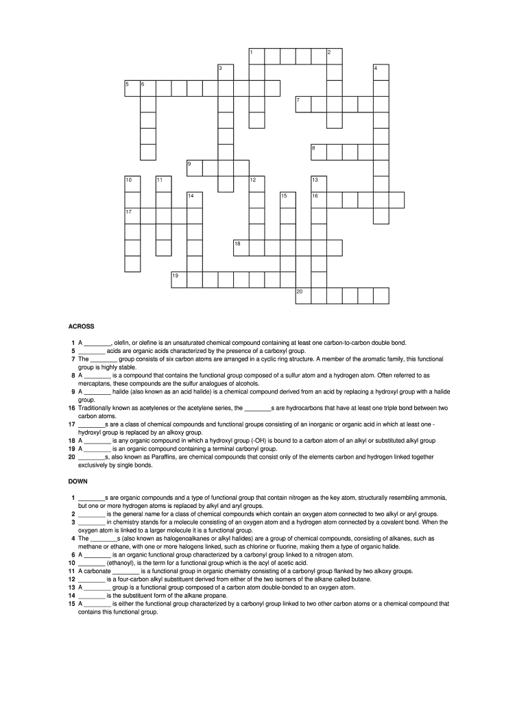 1 2 3 5 4 6 7 8 9 10 11 12 14 13 15 16 17 18 19 20 ACROSS 1 A, ole fin, or ole fine is an unsaturated chemical compound containing at least one carbontocarbon double bond. 5 acids are organic acids