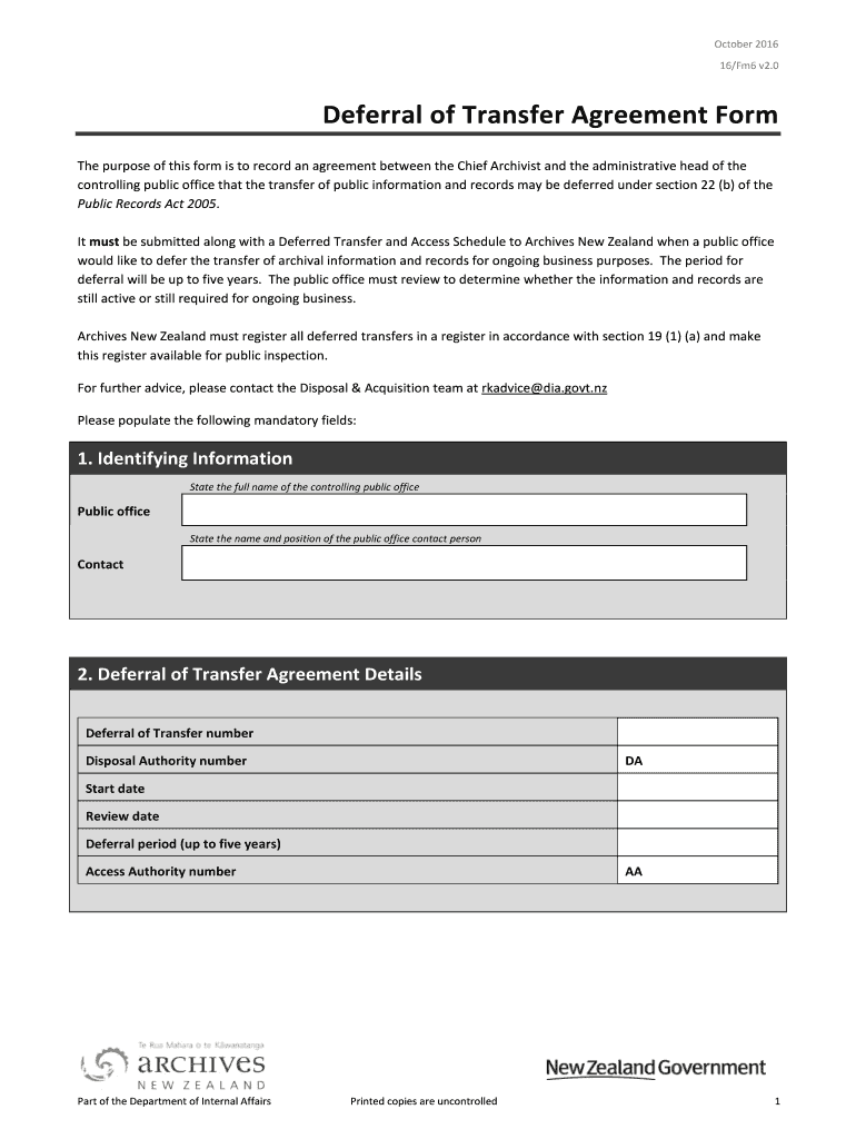 Get the free 16/Fm6 Deferral of Transfer Agreement form - Archives New Zealand - records archives...