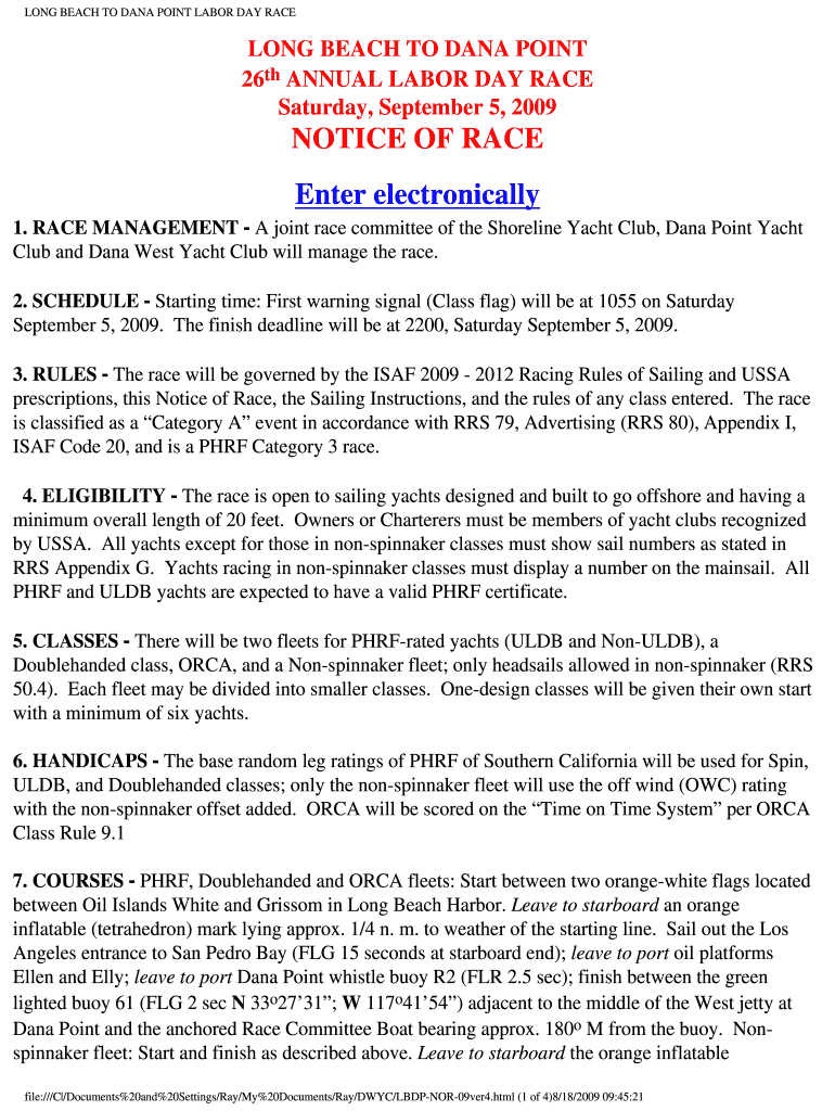 LONG BEACH TO DANA POINT LABOR DAY RACE LONG BEACH TO DANA POINT 26th ANNUAL LABOR DAY RACE Saturday, September 5, 2009, NOTICE OF RACE Enter electronically 1. RACE MANAGEMENT A joint race committee