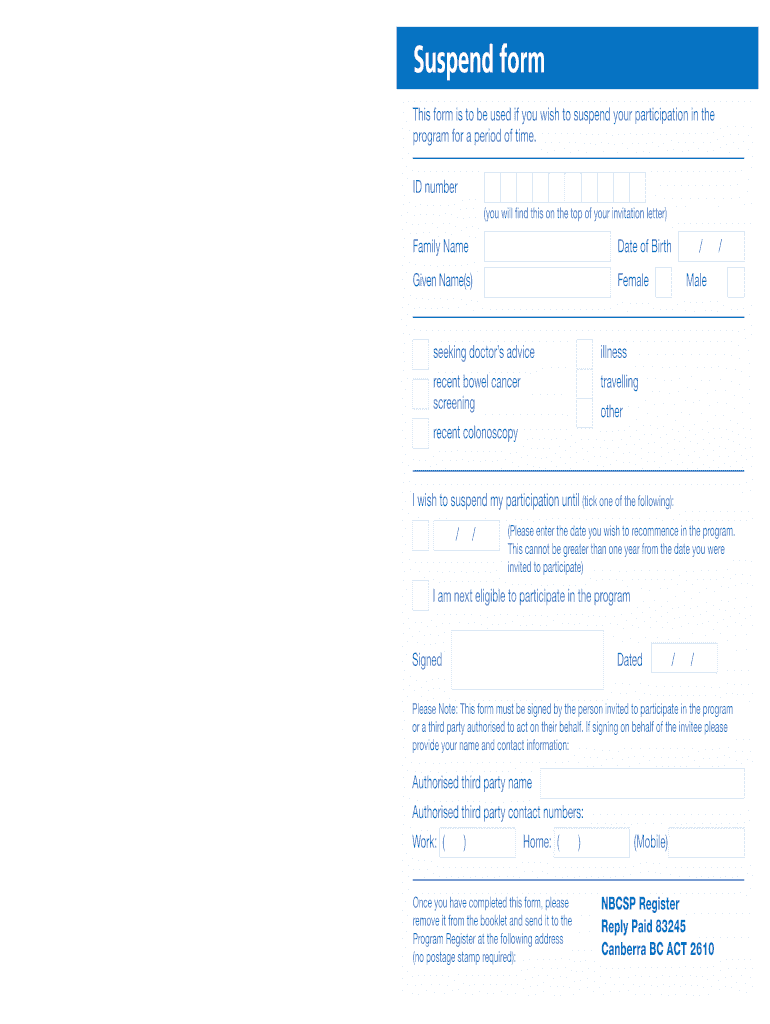National Bowel Cancer Screening Program Suspend Form National Bowel Cancer Screening Program Suspend Form This form is to be used if you wish to suspend your participation in the program for a period