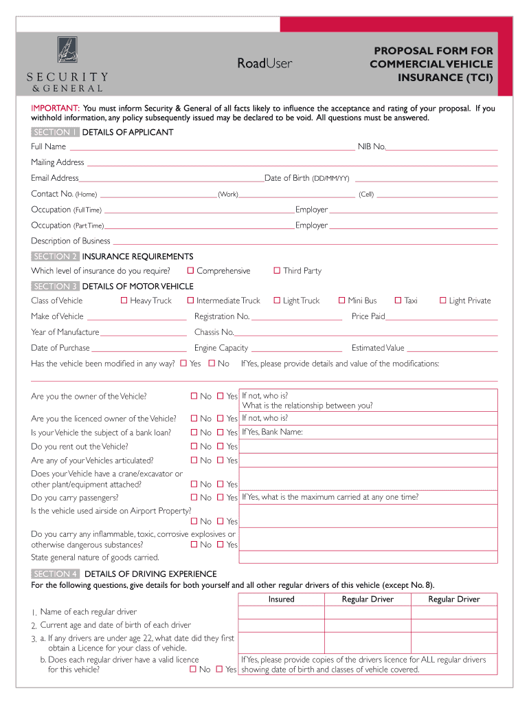 PROPOSAL FORM FOR COMMERCIAL VEHICLE INSURANCE (TCI) Roadster IMPORTANT: You must inform Security & General of all facts likely to influence the acceptance and rating ...