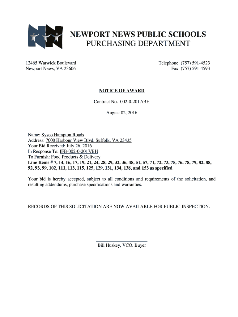 NEWPORT NEWS PUBLIC SCHOOLS PURCHASING DEPARTMENT 12465 Warwick Boulevard Newport News, VA 23606 Telephone: (757) 5914523 Fax: (757) 5914593 NOTICE OF AWARD Contract No. 00202017/BH August 02, 2016,