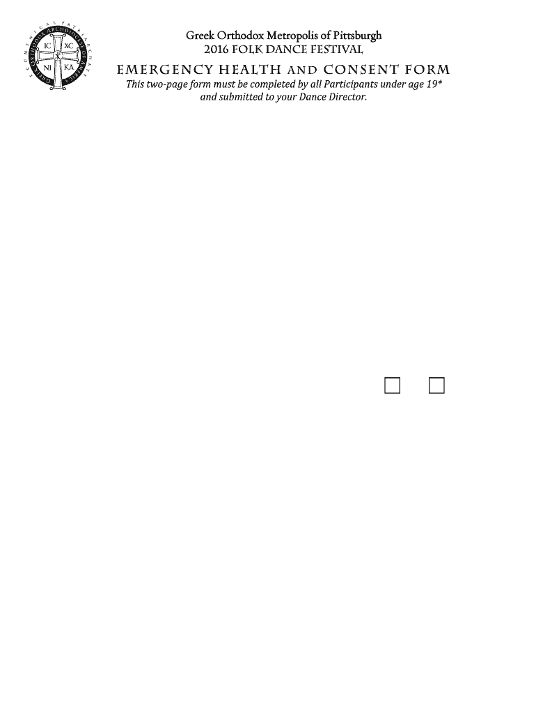 2016 FOLK DANCE FESTIVAL. EMERGENCY HEALTH AND CONSENT FORM. This two-page form must be completed by all Participants under age 19×.