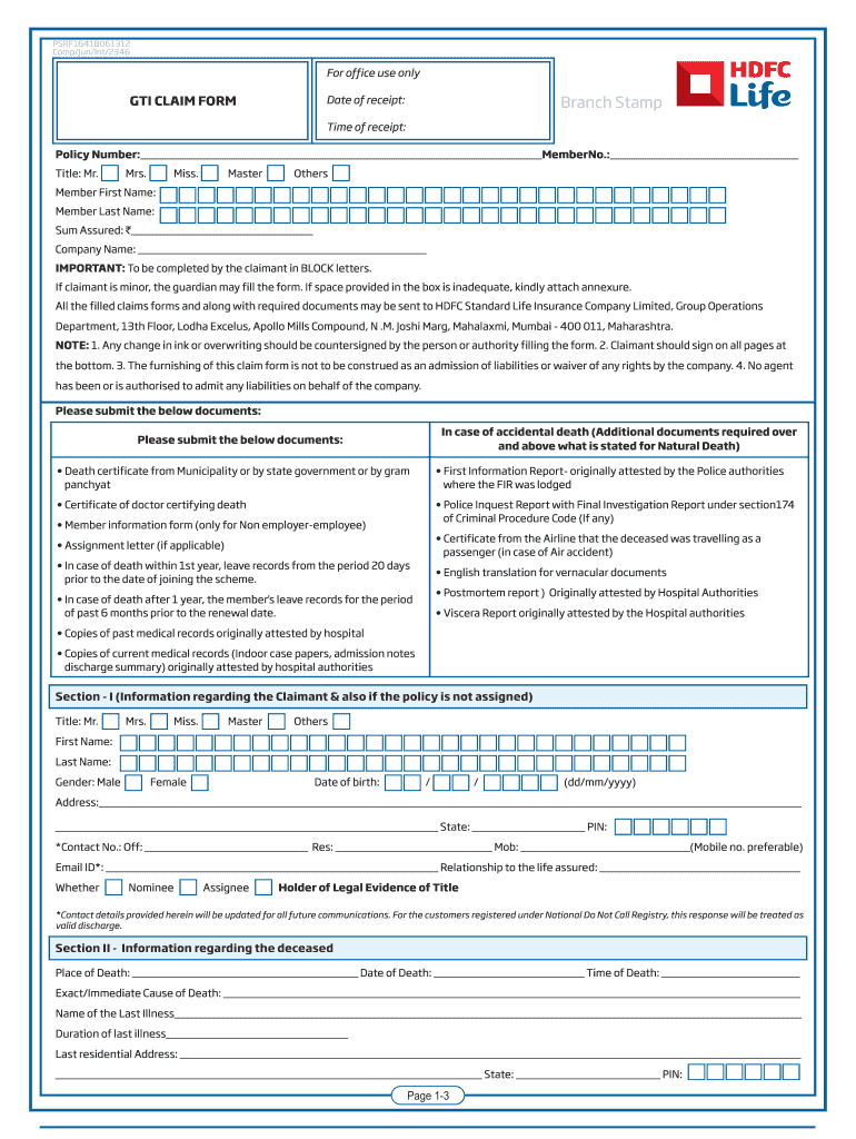 PSRF16418061312 Comp/Jun/Int/2346 For office use only Date of receipt: GTI CLAIM FORM Branch Stamp Time of receipt: Policy Number: Member No.: Title: Mr. Mrs. Miss. Master Others Member First Name: