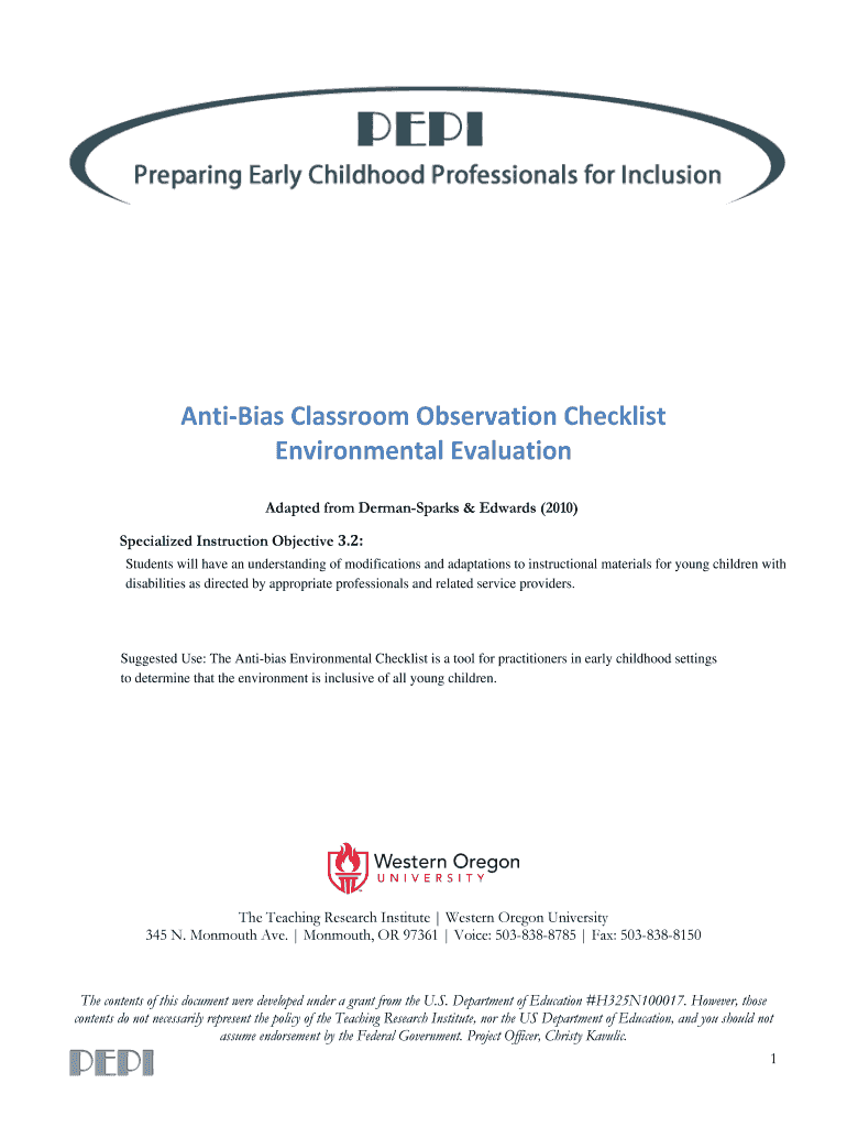 Get the free Anti-Bias Classroom Observation Checklist - documents teachingresearchinstitute