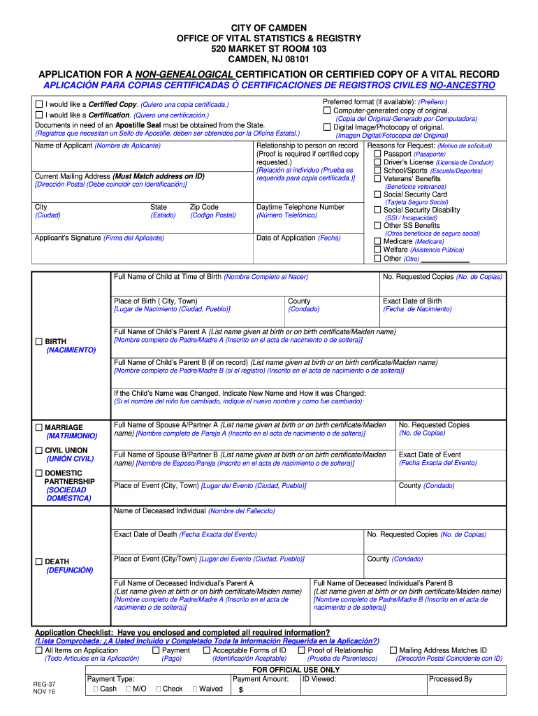 Get the free REG-37, Application for Non-Genealogical Certification or ... - ci camden nj