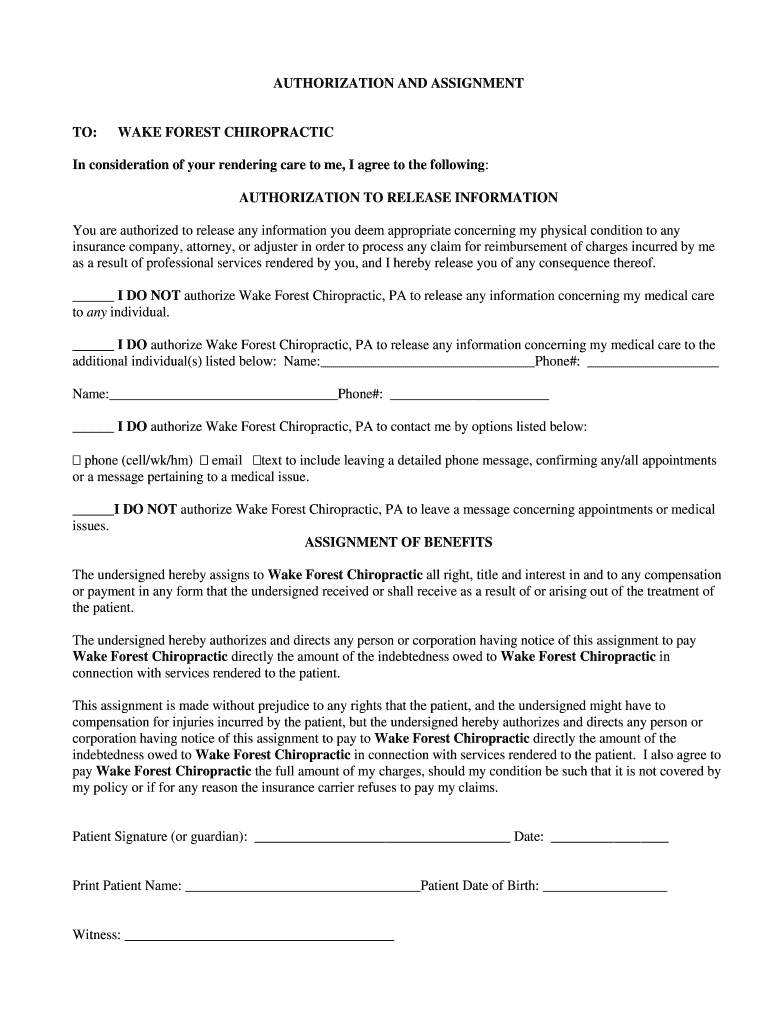 AUTHORIZATION AND ASSIGNMENT TO: WAKE FOREST CHIROPRACTIC In consideration of your rendering care to me, I agree to the following: AUTHORIZATION TO RELEASE INFORMATION You are authorized to release