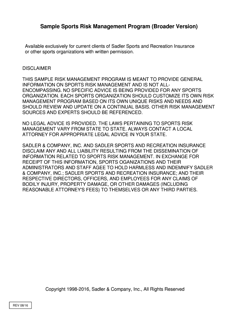 Sample Sports Risk Management Program (Broader Version) Available exclusively for current clients of Sadler Sports and Recreation Insurance or other sports organizations with written permission. DISCLAIMER