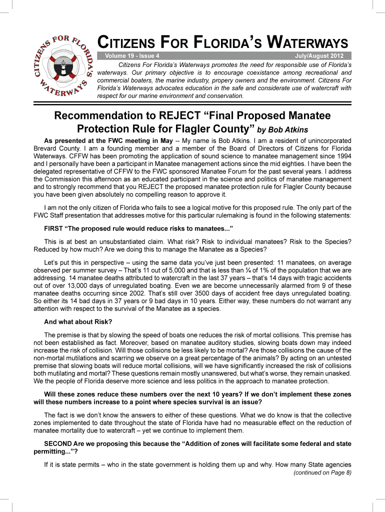 Citizens For Florida's Waterways Volume 19 Issue 4 July/August 2012 Citizens For Florida's Waterways promotes the need for responsible use of Florida's waterways. Our primary objective is to encourage