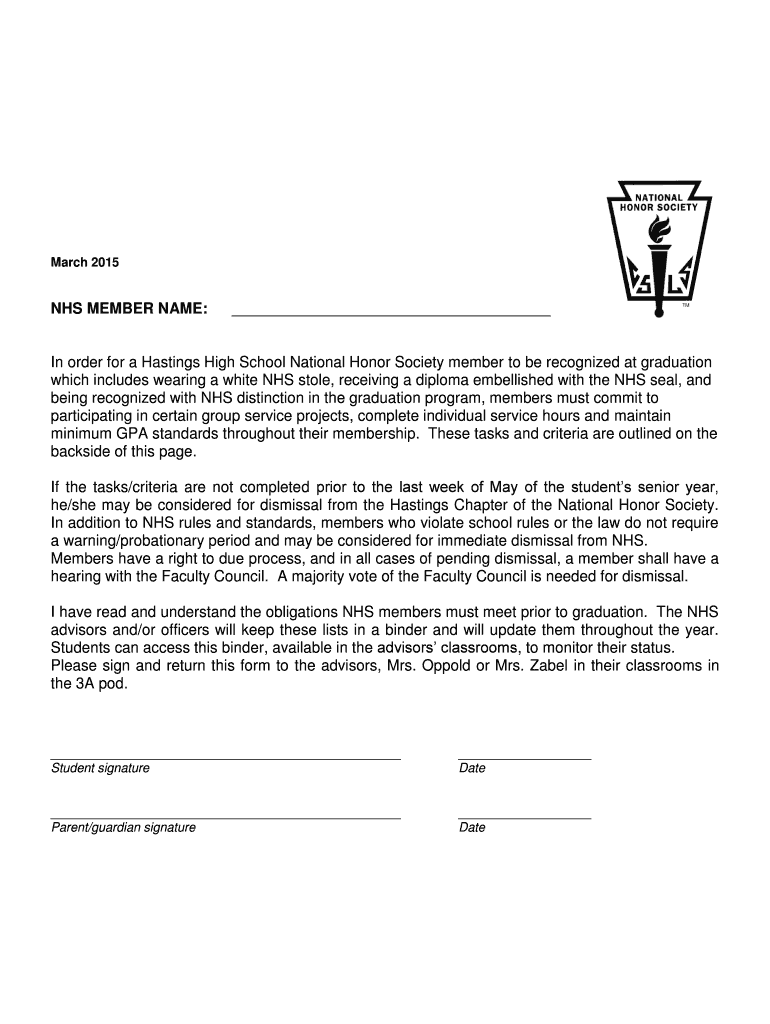 March 2015 NHS MEMBER NAME: In order for a Hastings High School National Honor Society member to be recognized at graduation which includes wearing a white NHS stole, receiving a diploma embellished