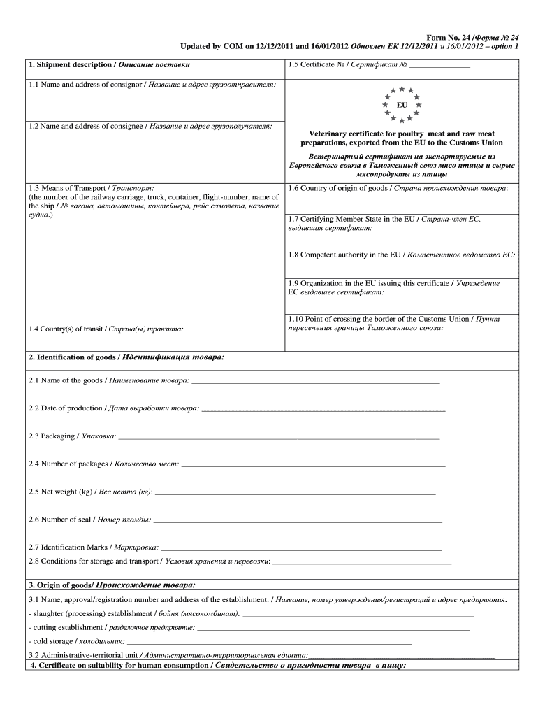 This certificate primarily targets poultry producers and exporters who wish to legally export their products to the Customs Union. The involvement of state or official veterinarians is crucial in the certification process, as they validate the document and ensure adherence to health standards.