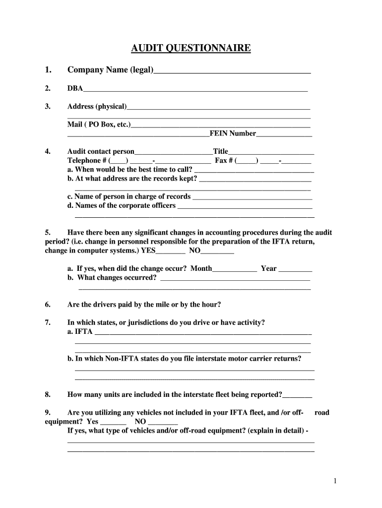 Get the free AUDIT QUESTIONNAIRE - IFTA, Inc. - iftach