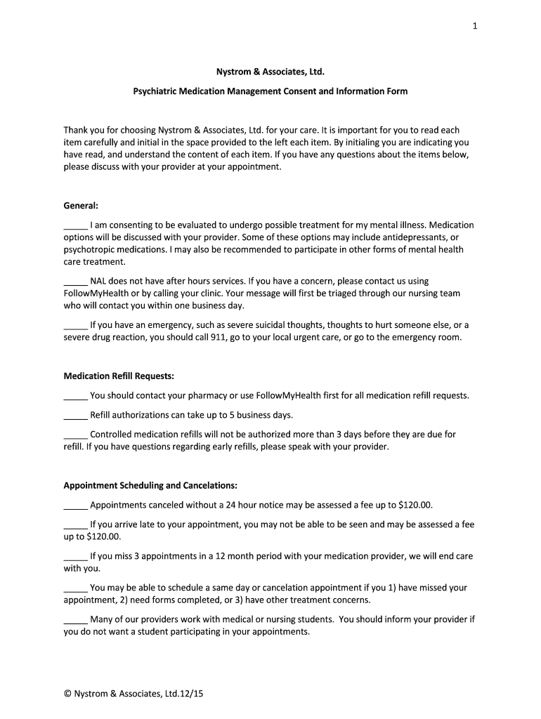 1 Angstrom & Associates, Ltd. Psychiatric Medication Management Consent and Information Form Thank you for choosing Angstrom & Associates, Ltd. for your care. It is important for you to read each