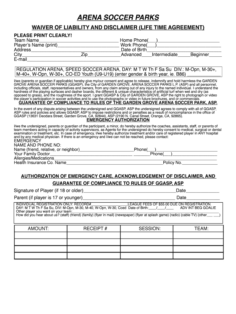 ARENA SOCCER PARKS WAIVER OF LIABILITY AND DISCLAIMER (Lifetime AGREEMENT) PLEASE PRINT CLEARLY! Team Name Home Phone() Players Name (print) Work Phone() Address Date of Birth City Zip Advanced Intermediate