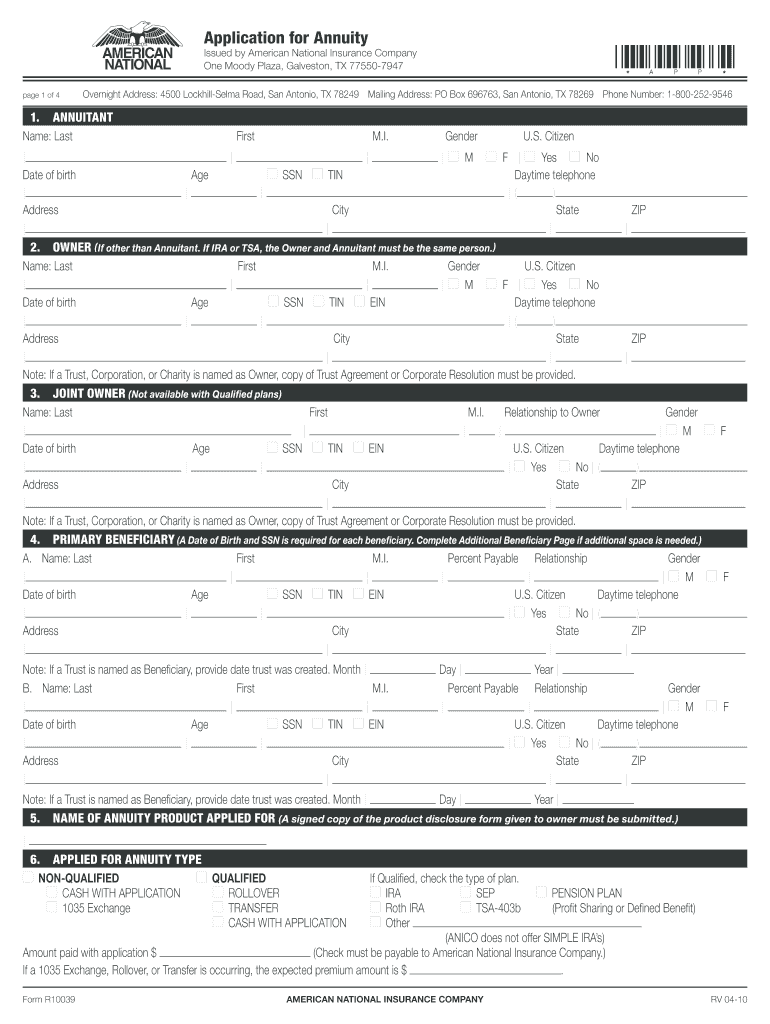 The Annuity Application Form serves as a crucial document for individuals seeking to secure an annuity from American National Insurance Company. This form plays a significant role in retirement planning as it initiates the process of applying for insurance annuities. By completing the annuity application form, applicants can effectively set the groundwork for their future financial stability.